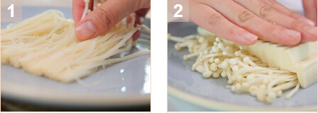 1.金針菇洗凈去頭,瀝干水分?jǐn)[在盤底,將嫩豆腐切片撲在金針菇上