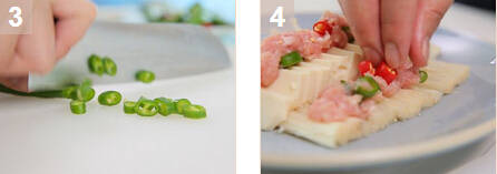 3.將拌勻后的肉末在豆腐上澆上豉油,隔水蒸8-9分鐘后出鍋