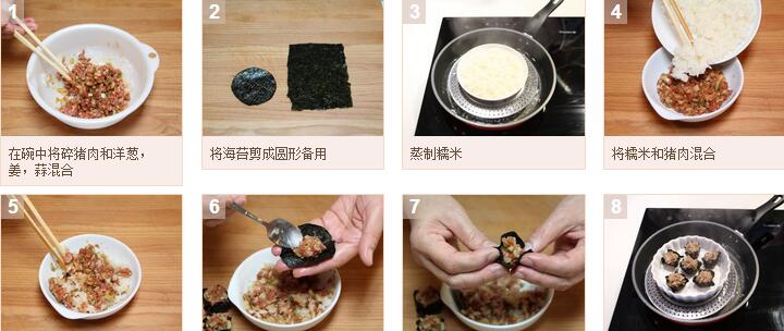 紫菜燒賣的材料:糯米120克,豬肉碎120克,蔥20克,20克,洋蔥40克,紫菜2-3大塊 美食網(wǎng)