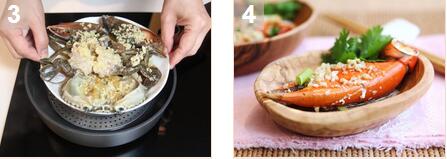 3. 螃蟹洗凈斬段,然后淋上調(diào)味料,隔水高火蒸8分鐘,最后加上蔥花和香菜出鍋。
