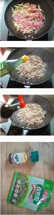 2..炒鍋加熱,下油,下姜絲辣椒和蔥頭煸香,下入牛肉絲翻炒,牛肉微熟脫色,下點料酒,下點醬油調(diào)色,下點胡椒粉和孜然粉調(diào)味,加蓋煮熟出鍋