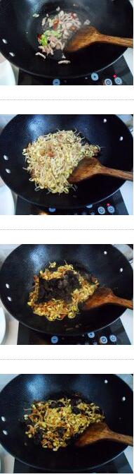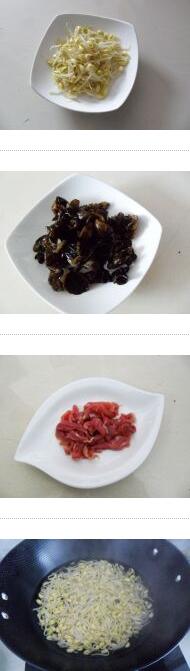 1.將黃豆芽淘洗干凈備用,黑木耳用溫水泡發(fā)去蒂洗干凈,撈出備用,豬肉切成肉絲。