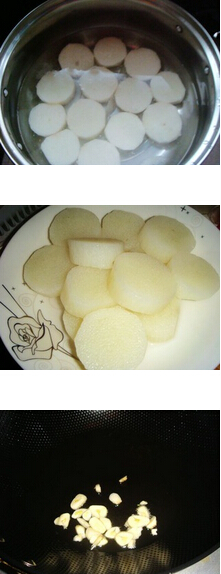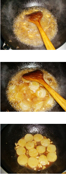 3.鍋里放少許油,油熱放入蒜末煸炒,倒入煮山藥的汁,添加白糖、醬油、醋,放入山藥少煮片刻,看到湯汁濃稠放入味精調(diào)味即可盛入盤中。