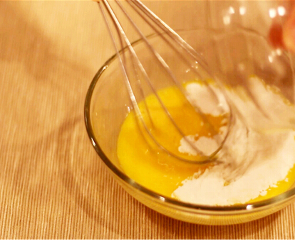 4.蛋黃攪勻,注意不要打出氣泡,加入剩下的糖粉,攪勻,沿著邊慢慢倒入煮好的混合液