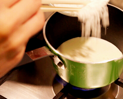 3.將混合液煮下,加入一半糖粉,煮到快沸騰的狀態(tài)時熄火