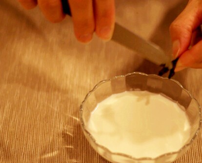2.牛奶倒入淡奶油中,將香草莢里的籽刮入其中