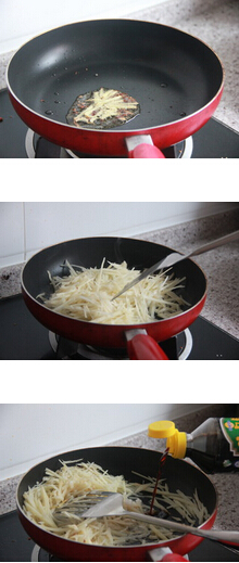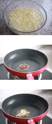 2 鍋熱后倒入油,待油溫3成熱時(shí),放入干紅辣椒絲,用小火慢慢煸香,然后撈出備用,鍋中放入切好的姜絲、花椒,煸香,放入藕絲,中火炒2分鐘,調(diào)入調(diào)料,倒入少量清水。