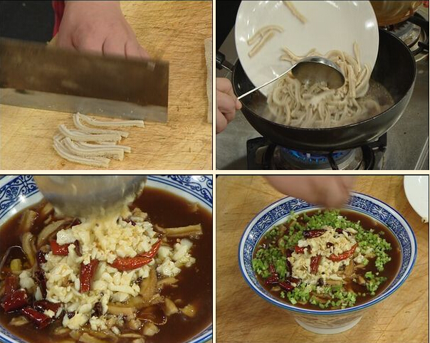 二: 鍋中留少許油下蔥,姜、蒜煸出香味下醋,料酒,醬油加水熬開,加入鹽,糖,胡椒粉調(diào)味,把蔥姜撈出,下入羊肚絲燉煮兩分鐘,打去浮沫,勾入水淀粉裝入容器
