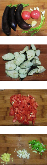 1.茄子切塊后在上面劃上幾刀,以便于入味,西紅柿切小丁,蔥姜蒜切末。