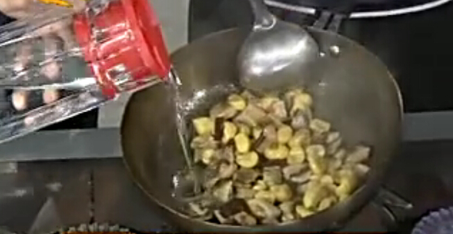 2. 另起鍋倒油 待油熱后放入冬菇煸炒并放入栗子 倒入湯汁 加少量水燒制片刻