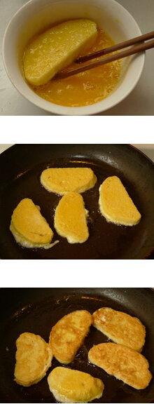 3.雞蛋放少許鹽,打散。 4.將切好的的饅頭片蘸滿蛋液。 5.平底不粘鍋內(nèi)放少許油,油熱后將饅頭片逐個(gè)放入。 6.中小火,一面煎好后翻面就做好了。