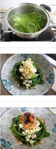 4.鍋內(nèi)燒水加少許鹽和油,水開后焯燙油麥菜1分鐘,撈出,過涼水。