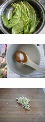 麻醬油麥菜的材料:油麥菜3顆,芝麻醬,鹽,醋,油辣子,1勺大蒜3瓣