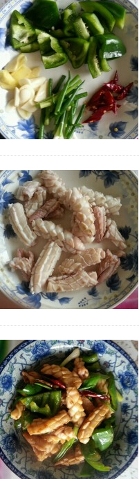 4. 青椒切塊,香蔥切段,姜蒜切片,干辣椒剪短備用。