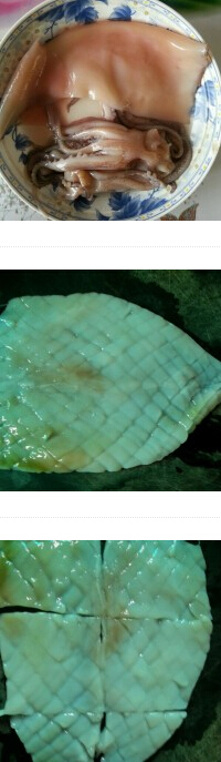 1. 魷魚開(kāi)膛,去內(nèi)臟撕掉薄膜,然后清洗干凈。