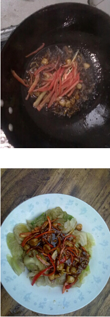 3 加入蠔油.后倒入水淀粉.放入發(fā)好的干貝和辣椒絲.鹽少許 4 把生菜裝盤,后將炒好的干貝淋上。