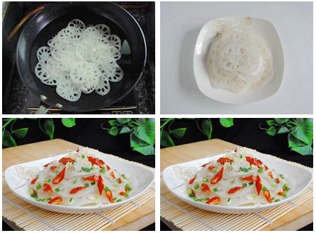 7、8、在藕片上撒上蒜末、香蔥末和剪好的紅椒段,然后起鍋燒熱適量油至冒煙,澆在藕片上即可。