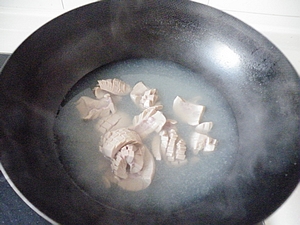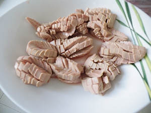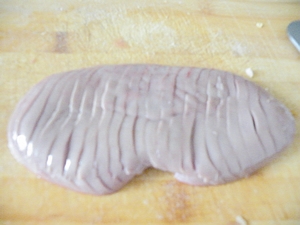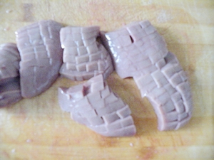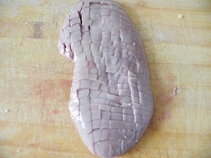 豬腰子在進(jìn)行刀工處理時,應(yīng)撕去外皮,片凈腰臊。改刀時,刀距應(yīng)均等,深度一致,直刀為原料的4/5,斜刀略淺,每片腰子以改四刀為宜,俗語有“燒三熘四”之說,燒,指燒腰花:熘,指熘腰花。這句話的意思是:做“燒腰花”時直刀的刀距略寬一些,每片腰花是三刀,而“熘腰花”刀距較密,每片腰花為四刀;