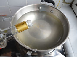 4、鹽水煮開后完全涼透后再加入白酒;要使用高度白酒,才比較容易出油。