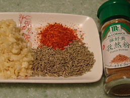 7 加入孜然粒和辣椒粉,炒出孜然的香味后再略撒一些孜然粉,炒勻即可。從最開始炒,大約需要10分鐘,始終小火。
