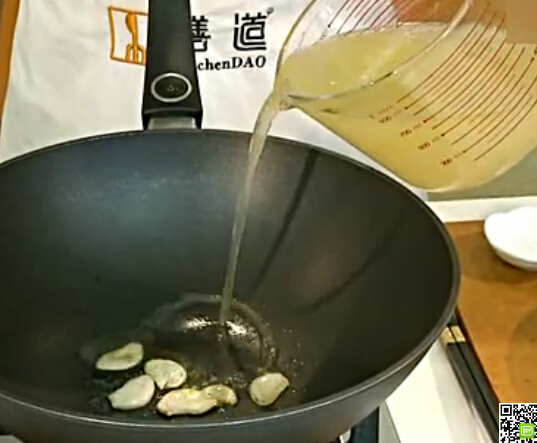 6、坐鍋倒油下姜片翻炒,趁熱倒入500ML高湯或開水,待水翻滾時放入肉片,滾上3-5分鐘,舀去浮沫,調(diào)味(糖、鹽、雞精各少許)最后放入涼瓜青