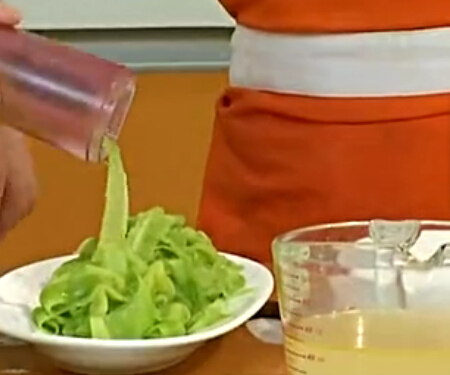 上湯涼瓜青的做法: 1、將涼瓜刨成長條備用,剩下的心不要 2、在涼瓜青中放兩大勺鹽