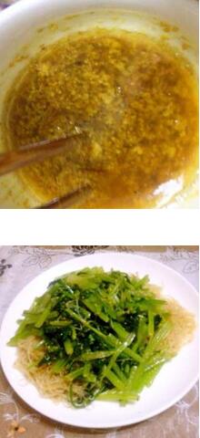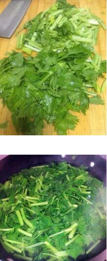 3.鍋中水開后將芹菜煮熟??梢韵确徘鄄藯U,稍煮下再放葉子,煮的時候不能蓋蓋子,不然菜就黃了。煮好后撈出擠干水分;再放入粉絲或粉皮煮好撈出。