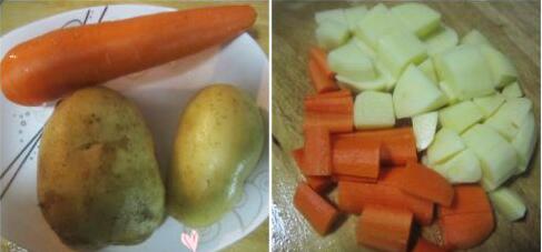 2.胡蘿卜、土豆去皮切丁(稍大)。 學(xué)做菜