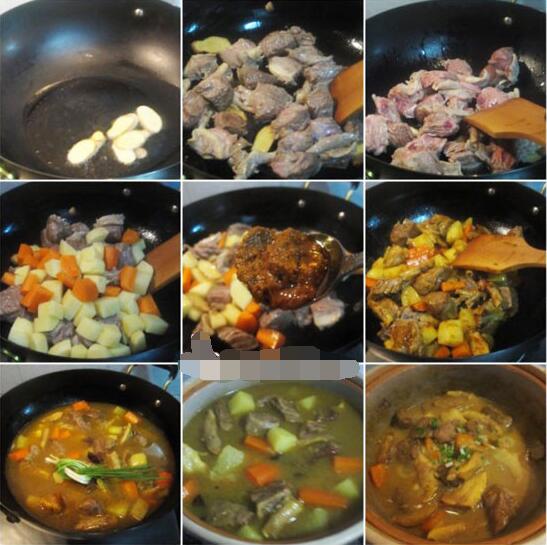 5.坐鍋熱油,下姜片熗鍋,放牛腩炒到變色,放土豆和胡蘿卜丁,加二大勺油咖喱翻炒均勻,加水,放蔥、茴香和桂皮,大火煮開后轉(zhuǎn)小火1.5小時(shí),轉(zhuǎn)大火,嘗一下味,,加鹽,撒上蔥花出鍋。