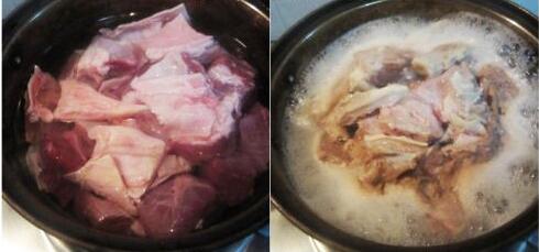 1.牛腩切成小塊。入鍋冷水焯水,水滾關(guān)火,用流動(dòng)的水沖洗去浮沫。