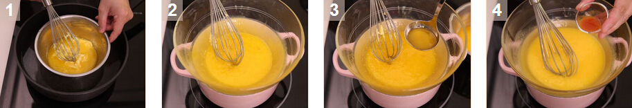 1. 準備荷蘭醬:先熱溶牛油,用勺盛去表面泡沫及白色的凝固物,使牛油變?yōu)閮艋S?/p>