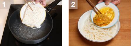 1. 蔥切絲。烏冬面在滾水中煮2分鐘,然后取出瀝干,放入冷水中,再次取出瀝干備用。