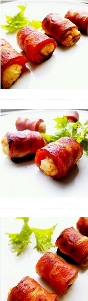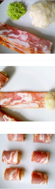 2.一點(diǎn)奶油用手沾水弄成照片那樣放培根上面。培根本來(lái)有鹽味所以土豆泥沒有放鹽,卷成卷用牙簽扎牢。