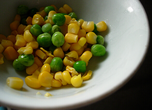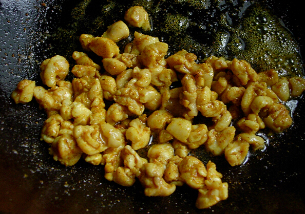 2、做鍋倒油,油燒至六七成熱時放入咖喱粉略炒(注意:為防止枯焦,火關(guān)小或者離火炒)后放雞丁,然后放玉米粒、豌豆粒、米飯(最好是冷藏過的隔夜的米飯,大火顛炒,略調(diào)鹽即可。