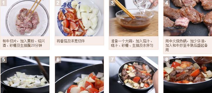 5.同一個鍋中用剛剩余的牛油炒香蒜片及洋蔥后加入番茄煮2分鐘,再加入和??斐粗潦欤尤脶u汁炒勻直至牛肉平均沾上醬汁就好了