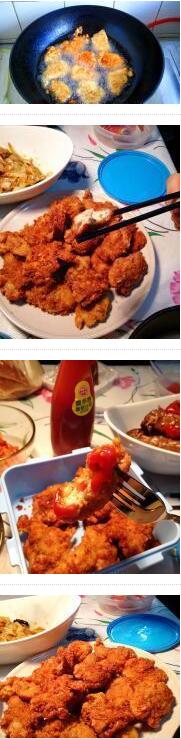 4.油鍋熱了之后,把包裹好各種材料的雞塊下鍋。掌握好火候,顏色變成金黃色后差不多就好了,可以開吃了