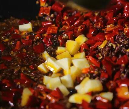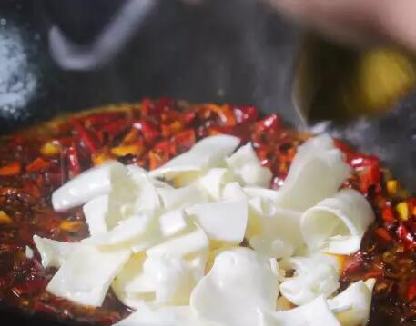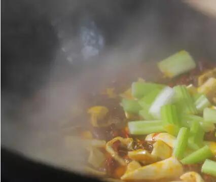 3.坐空鍋,加入紅油、干辣椒、花椒、姜、蒜、香辣醬、啤酒炒香后下入黃喉,翻炒均勻,最后放入,西芹、洋蔥、蔥段,爆香起鍋即可。