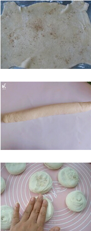 3.取一塊面團(tuán),搟成大餅皮,抹上餡料中的材料:油,鹽,酥,花椒粉,卷起大餅皮,揪成劑子,把兩端的口收住,卷起,按扁