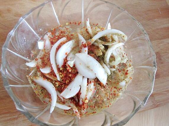 1.把羊排切好要的份量去邊邊,用叉子把羊排扎上好多小孔,把洋蔥去皮切絲,把洋蔥絲辣椒粉孜然粉胡椒粉鹽加少許水一起拌均勻