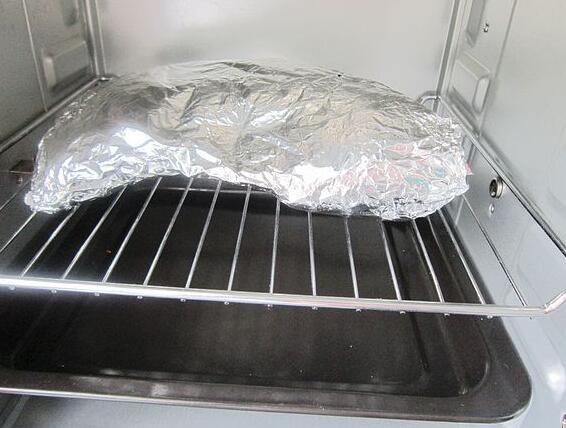 3.烤羊排之前,把腌制的羊排提前拿出一小時(shí),把烤箱200°用上下功能預(yù)熱5分鐘,把腌制好的羊排和洋蔥塊一起用錫箔紙包好,將錫箔紙四周包嚴(yán),放在烤架上,用200°度先烘烤50分鐘。