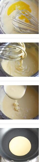 4. 取一個不粘鍋,小火,預(yù)熱一會兒后舀一勺面糊入鍋中心,當(dāng)面餅表面出現(xiàn)一些小孔,翻面煎,翻面再煎30秒左右,視底部中間顏色略深即盛出。