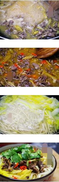 3.燒一鍋水,待水開后下入白菜,再次水開后,將白菜撥至一邊,下面條,菜面都熟了以后撈入碗中,澆泡椒雞雜及湯汁,撒香菜末開動(dòng)吧