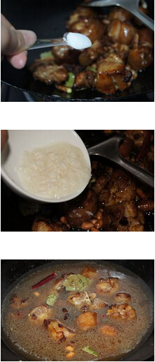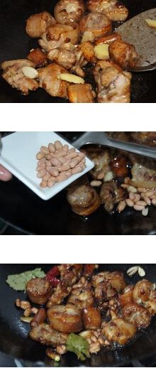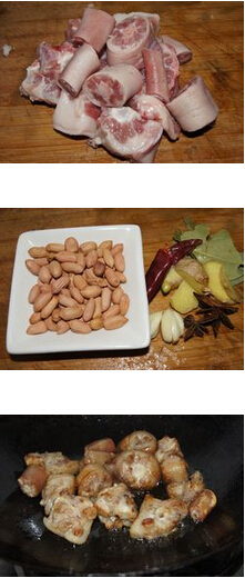 2.鍋里放油,炒糖色,然后放入豬尾炒均,放入姜蒜炒香,接著放入花生翻炒片刻,放入香葉 八角 辣椒炒香,放入適量的鹽炒均,放入一小碗米酒炒均,最后放入清水煮至收汁,放入雞精調(diào)味即可。