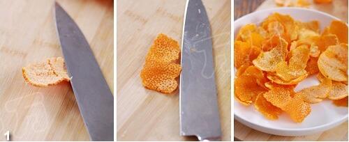 1.橘子剝皮,把外皮朝下,白色一面朝上,用刀慢慢去掉白色部分不要。大約用700g桔子的1/4果皮即可。皮太多了做出的醬就會過于苦了