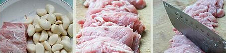 1、大蒜剝好去蒂切片,豬肉切約2mm厚的片,切好后碼整齊用刀背敲敲,這樣的肉比較嫩滑; 學(xué)做菜