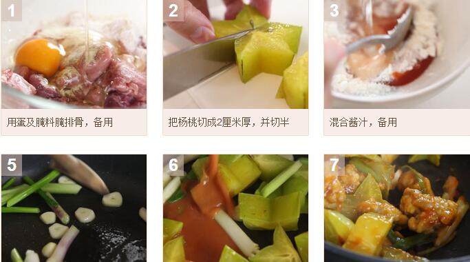 楊桃咕嚕肉的材料:1個楊桃,300g排骨,30g蔥,30g姜,1瓣蒜頭,