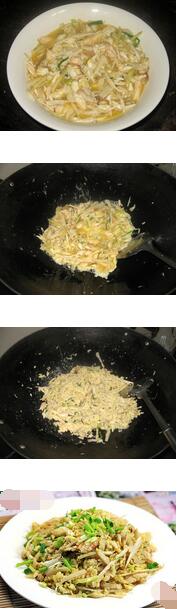 5.坐鍋倒油,將雞蛋混合物下鍋快速煸炒,雞蛋炒成桂花狀就可以出鍋了。