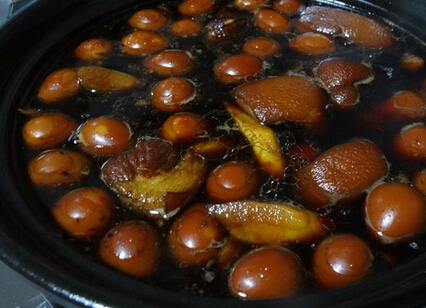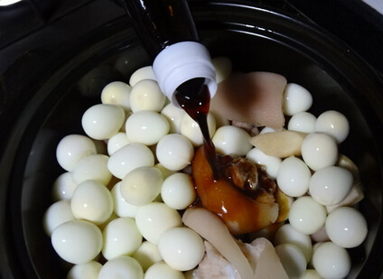 3.子姜洗干凈,削皮,切塊,鵪鶉蛋煮熟后,剝殼備用,將豬蹄、鵪鶉蛋、子姜放進(jìn)瓦鍋,加入所有輔料,大火燒開(kāi)轉(zhuǎn)小火煮40分鐘關(guān)火即可