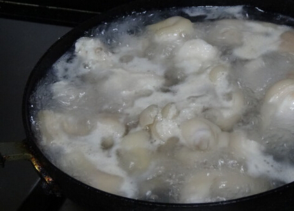 1.將整只豬腳冷水下鍋,煮至表面變色,把臟污血水倒掉,用拔毛刀拔掉豬腳上的毛