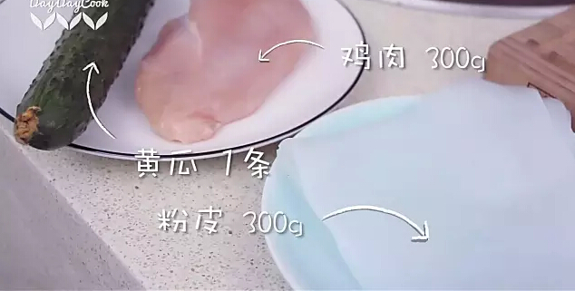 麻辣雞絲粉皮的材料:雞胸肉225g、粉皮2張、綠豆芽75g、蔥2根、姜2塊、生菜2片,芝麻醬2大匙、醬油1大匙、醋1大匙、糖1茶匙、味精1茶匙、麻油2茶匙、辣油2茶匙、蒜末、鹽